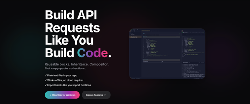 The basic idea of Voiden is that instead of being static forms, API requests are composed by using blocks (endpoint, auth, params, body). Blocks that you can add, reuse, override, and stitch together across files (more like functions than requests).