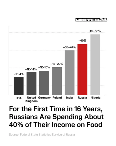 That source is kind of wonky. It’s just a picture posted somewhere with a not-verifiable source written on it, so there is not a lot to say about this. But if those are real statistics from russia: We kind of know that russia is totally faking their statistics for propaganda reasons and if they publish that statistic, the reality will be much, much worse. And 40% seems to be the average here. Which means that there will be many people on the lower end of the income scale who have to spend a bigger amount.