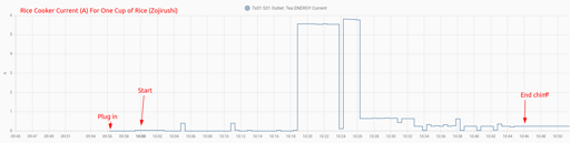 For comparison, 50 minutes to cook 3 cups of white rice (v. 1 cup of white in the original). Similar for the mid/end sections, but seems like the 1st section it drew a lot more current, maybe just more heat for a larger volume of water during the soak.