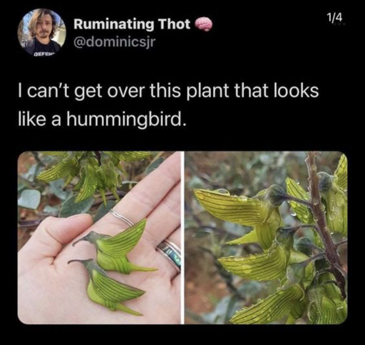 The appearance of the flowers of Crotalaria cunninghamii has been debated whether it resembles a bird by natural selection or if it is due to chance. The debate is whether the flowers are bird shaped to ward off unwanted predators or to attract certain pollinators, known as Batesian mimicry, or if it is just by chance that they look like birds and humans have associated the shape of the flower with a bird, known as pareidolia. Michael Whitehead from the University of Melbourne stated that the shape of the flowers are consistent with bird pollination, with its large flowers and long keel on its petals. This makes sense because the predominant pollinators of Crotalaria cunninghamii are nectivorous birds and bees.[7] There are a large number of plants with flowers that look like animals, such as the Dracula simia (monkey orchid) that looks like a monkey or the Phalaenopsis (Moth Orchid) that looks like a moth.[8] These plants have the same debate surrounding their unique appearance.