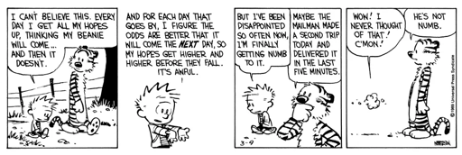 I love reading these in the original “rhythm”, one per day. I’ve been excited for that beanie to finally be delivered almost as much as Calvin.